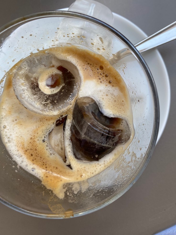 Intanto che il caffè va, metti tre quattro cubetti di ghiaccio (non lesinare) in un bicchiere e versa un dito (in orizzontale…si lo so é una unità di misura un po’ approssimativa ma non credo nessuno si sia mai preso la briga di misurarne i ml esatti) di sciroppo di latte di mandorla. Quando il caffè é pronto versalo prima nella tazzina: questo passaggio é fondamentale non solo in quanto ti consente di dosare il caffè, ma anche perchè permette di conservare intatta la fragranza mentre si raffredda leggermente (se lo versassi direttamente sul ghiaccio lo scioglieresti all’istante con il risultato di annacquare la bevanda). A questo punto puoi versare la tazzina nel bicchiere in cui hai predisposto ghiaccio e latte di mandorla e mescolare con un cucchiaino. Vedrai che il caffè si raffredderà velocemente, e pur mantenendo la sua fragranza, risulterà dolcificato dalla mandorla oltre ad arricchirsi del suo aroma. Ora puoi godertelo, sorseggiarlo magari chiudendo gli occhi e pensare alle tue vacanze, sgranocchiare il ghiaccio, leccare dalle labbra i residui dello sciroppo. Una volta terminato io aggiungo nel bicchiere un poco di acqua in modo da potermi ancora gustare quello che resta dello sciroppo di mandorla. E’ una pratica un po’ audace che non tutti condividono, tuttavia.